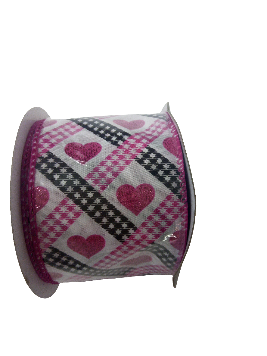 2.5 X 10YD Hot Pink, Black and White Valentine's Day Heart Lattice Ribbon - 153725HP