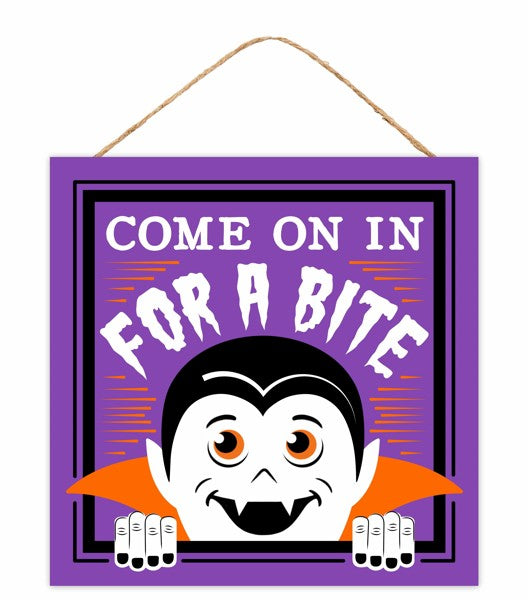 10"SQ COME ON IN FOR A BITE VAMPIRE SIGN - PURPLE/ORANGE/BLK/WHITE - AP7416C3