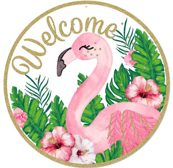 12"DIA GLITTER WELCOME FLAMINGO SIGN - WHITE/PINK/GREEN/GOLD - MD0830