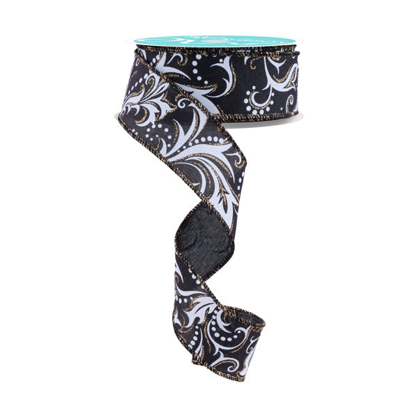 1.5"X10YD LEAF FILAGREE W/DOTS - BLACK/WHITE/CHAMPAGNE - RGF144602