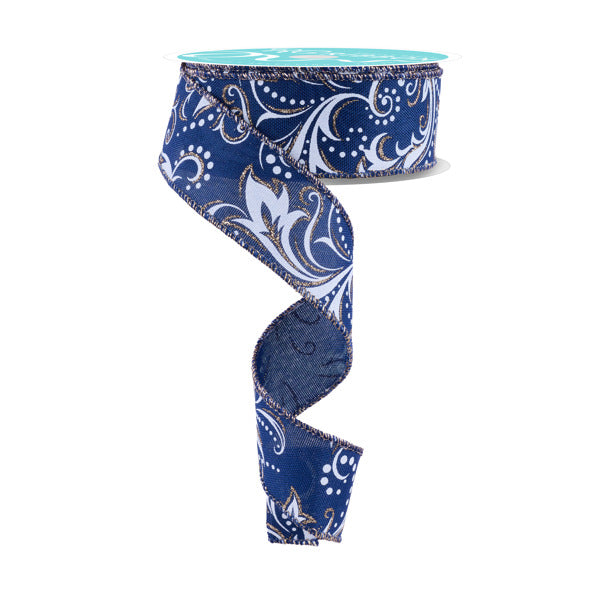 1.5"X10YD LEAF FILAGREE W/DOTS - NAVY BLUE/WHITE/CHAMPAGNE - RGF144619